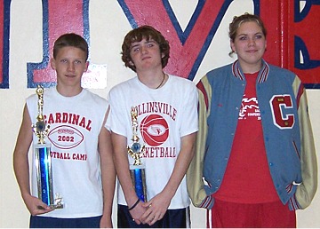 The State Free Throw Shooting Contest was held today in Shawnee at St. Gregory's University. Three of our local Collinsville residents participated. Cole Overholt finished first in the 12-year old division. Jeff James finished 2nd in the 14-year old division. And Katie Sullivan participated, but did not place in the top three.