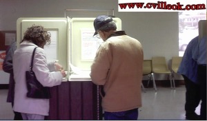 | These voter cast their ballots at the Collinsville Health Center Tuesday. The lines were short enough at about 9am for the election workers to look up from their work. The voters had to choose between U.S. Presidential candidates George W. Bush and John Kerry, as well as local officials and state questions. |