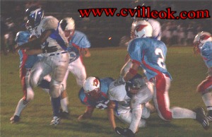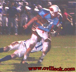 | Plays like these helped set up Collinsville's first score. Andrew Evans (#51 above) throws Webster for one of two losses before they had to punt. That punt was partially blocked and the Cards started on Webster's 27 yard line. Lenard Creek (#21 below) carried the ball down to the 3 yardline on 4 carries before Lance Kite carried the final 3 yards. |