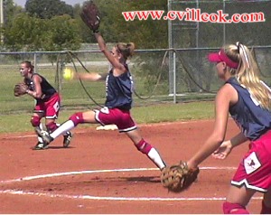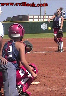 Perkins delivers the pitch with Amanda Bolien catching on Oologah's field.