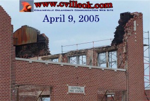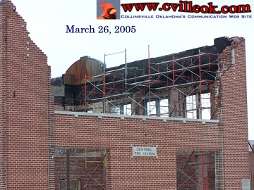 The two photos above show a big section of original City Hall bricks (from the fire & weather damaged east wall) which have been removed. Apparently the inspection of this section (below back in March 2005) showed this section needed replacement. The front top portion of the building fell on its on in March 2002 a few months after the Dec. 1, 2001 fire. |