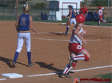 running for Amanda Bolien) heads to 3rd base. |