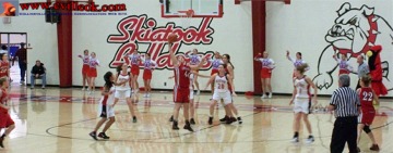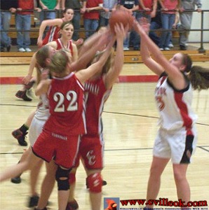 The Lady Cardinals were down by 2 points but had a timeout with 4.9 seconds left and Laura Castleberry in possession (above). Coming out of the timeout (below) Katie Bryant drew most of the Lady Bulldog defenders as she passed to Castleberry under the basket for the final 2 shots. Laura's first shot rimmed out but she put it back in. That shot appeared to beat the buzzer and send the game into overtime but the official waved it off handing a loss to the stunned and disappointed Collinsville players and fans. |