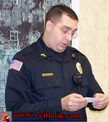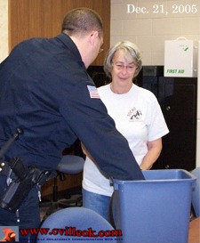 Collinsville police officer Travis Linzy drew the name of Tucker Bouressa (of Owasso) as the winner of the FOCAS gift certificate to Bass Pro. Friends of the Collinsville Animal Shelter President Marlene Spicer, watches the drawing above (at the Collinsvile Police Station Wednesday Dec. 21st) and Officer Linzy announced the winner below. |