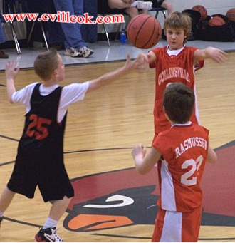 Collinsville's Henderson (#7 in red above & below) launches a successful long shot just before halftime against Skiatook. |