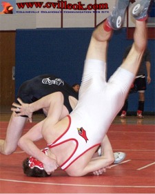 Jordan Scruggs was the fourth Cardinal wrestling for a top finish (at 152) but lost 4-7 and also lost some blood with a cut on the back of his head during the bout. |
