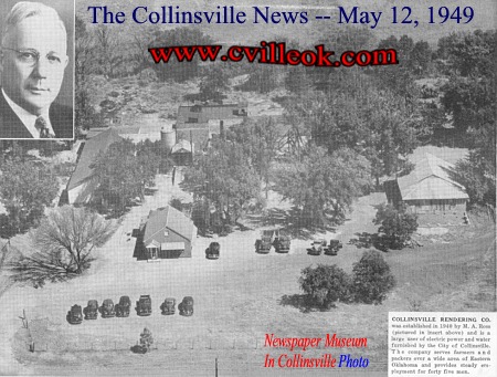 This photo from the 50th Anniversary Issue of the Collinsville News (& Collinsville) in 1949 gives an early day view of the then approximately nine year old enterprise at the same location as the plant shown above. The text on the photo read: "Collinsville Rendering Co. was established in 1940 by M. A. Ross (Pictured in inset above) and is a large user of electric power and water furnished by the City of Collinsville. The company serves farmers and packers over a wide area of Eastern Oklahoma and provides steady employment for forty five men." -- Ted 1/16/2005 |