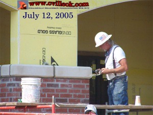 White roofing material is lapped over the walls that extend higher than the roof. This will be trimmed and capped soon to completely seal the new roof of City Hall. |