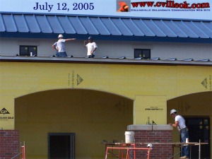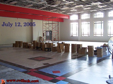 The colorful tile floor for the new middle school cafeteria is nearling completion this week. The cafeteria is expected to be complete enough to start storing furniture there starting July 18th and then be ready for students the first day of school August 18th. |