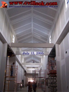 The long tall interior hallway of the new middle school building is sheet rocked now. This view is looking from near the cafeteria on west end towards the library on the east end. |