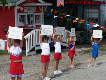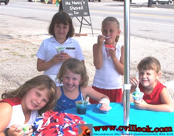 Some of the Mighty Mites Cheerleaders were selling fund raiser items Friday afternoon at Ms. Nancy's. These girls are raising funds for wind suits and trophies for their upcoming games. Jerry's Auto Service donated items for the 1st & 2nd graders to sell. They were working July 4th also. They cooled off Friday (July 8th) with some Ms. Nancy's Shaved Ice before they started. Contact leaders Michelle Hawkins and Kyle Badertscher if you would like to help the group. |