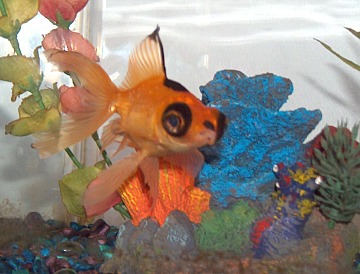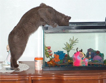 top photo, with Smokey the cat sharing water with the no-name fish below.
