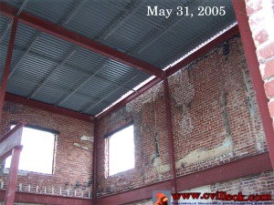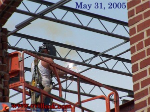 Tuesday afternoon (May 31st) I took the shot above with the worker connecting the roof trusses in the middle portion of City Hall. Just a few hours later the sheet metal was installed and the majority of City Hall was once again under a roof. (Previous Coverage) |
