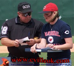 Card's scorekeeper Jayme Howard confers with the umpire to try and keep it all