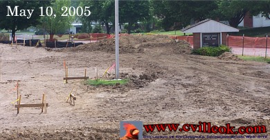 The Community Church construction site has progressed enough for stakes to begin marking the outline of the new building features (at 14th and Oak). |