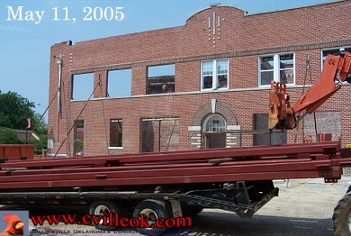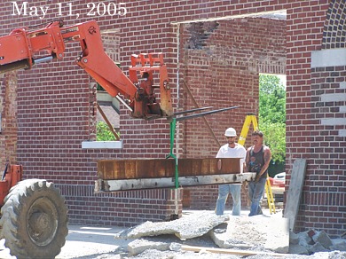 New steel arrived at Collinsville City Hall today (above) and one of the old steel beams was removed from the front of the building (below) and sent away on the truck that delivered the new steel. The new steel will form a structural skeleton inside the historic brick walls in the building built in 1913 and damaged by fire in 2001. |