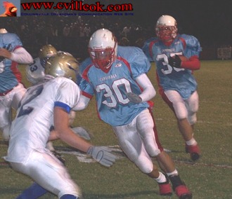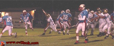 Collinsville's first possession got things started in the wrong direction with a holding penalty followed by an interception. Collinsville's receiver slipped as the pass arrived and Oologah's defender ran it back from the 40 to the 6 yard line. Oologah scored 3 plays later from the 1/2 yard line. Nick Rabbit was injured at some point in that sequence of plays. Oologah had a 0-7 lead at 9:01 in the first quarter. |