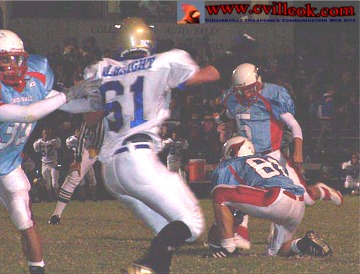 Tyler Chronister kicked a field goal at 7:01 of the 2nd quarter for Collinsville's only points of the first three quarters. Collinsville had reached the 14 but faced a 4th and 8. The drive started when the Card's held Oologah and took over on downs at their own 29 yard line on the first play of the second quarter. |