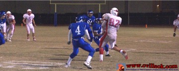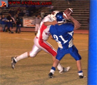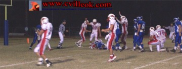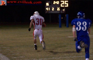David Chester (#82 above) has just caught a "hook" pass from QB Tyler Chronister (#5) and is preparing to lateral ("ladder") to Lance Kite (#30) barely visible on the right side of the top photo but centered in the photo below as he finishes the play with a touchdown in the 3rd quarter to reach 27-16. The play started at Collinsville's 41 yard line on a 2nd and 26 play. |