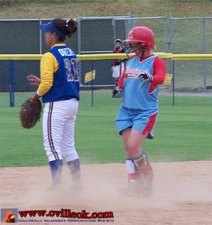 Pelletier prepares to take off from second base as Hillary Brown hits an infield