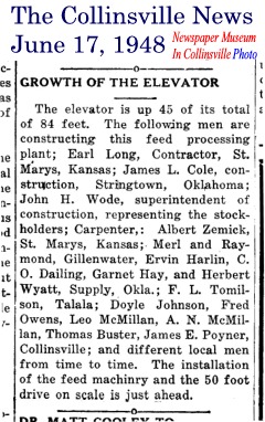 A September 1948 ad for the grand opening of the Farmer's Union Co-Op elevator listed E. Thresher as Manager and Dale McDoulett as Plant Manager. The 50,000 bushel capacity feed processing plant listed the following features: feed grinding, mixing, molasses mixing, feed and seed cleaning, seed separating, public weighing over new bonded 80,000 lbs. capacity scales. |