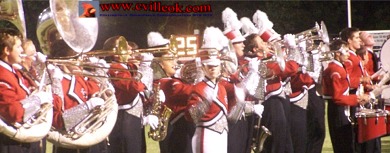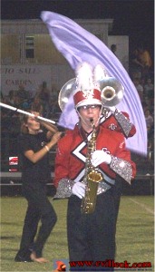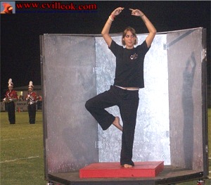 Kacy Keith emerged from the music box to begin the Crimson Cadet Band's haltime