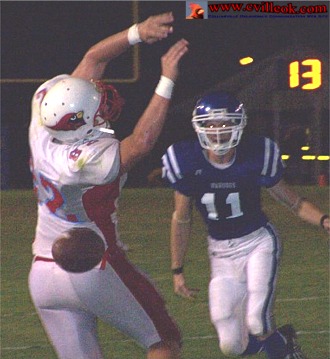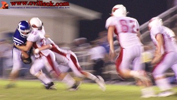 Collinsville had driven to Miami's 25 yard line in the second quarter but stalled facing 4th and 17. Following a time out to talk it over, Collinsville went for it and David Chester (#82) was this close to catching this Tyler Chronister (#5) pass in the end zone. The ball had been deflected by the defender. |