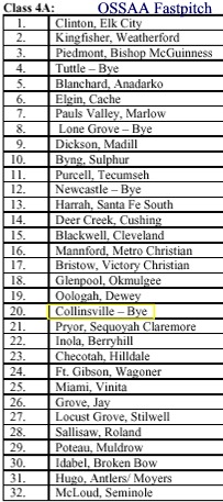 | All of the following 4A District Softball pairing games are due to be completed by Sept. 24th according to the OSSAA web site. Collinsville has a district game bye into the regionals. |