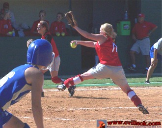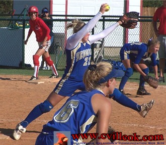 | Kelli Dunagan (#11 above pitched a 9 inning shutout of Sequoyah but was nearly matched by Claremore's pitcher (below) as the Lady Cards couldn't get a run across until the 9th. Mandy Clark (#6 3rd baseman) for Sequoyah was on Collinsville's roster last year. |