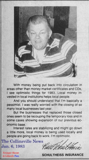 I think the outlook for Collinsville in 2006 is very good. The boom in new home construction is bringing a lot of new families to town. Because of the growing population, I think 2006 may be the year that we see some big-name fast food restaurants and some popular national and regional retail stores. This will be a boost to our tax base, which will enhance the citys ability to serve the populace and to continue improving our infrastructure. As always, convincing local residents to do their shopping in Collinsville is vital. But today its more difficult, because almost everything we used to drive to Tulsa for is now only five or six miles away in Owasso. Collinsville has a lot to offer - an excellent school system, a progressive chamber of commerce, a close-knit business community, and a real hometown feel. I see a bright future for Collinsville. Bart Schultheiss -- Jan. 2006 |