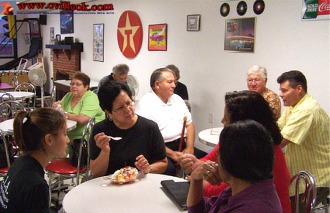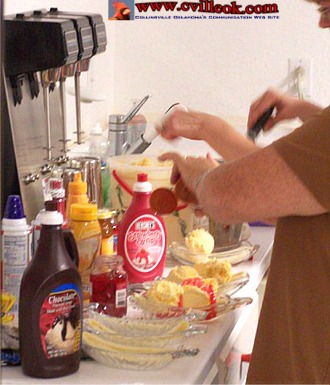 After their regular monthly business meeting and a slideshow of historic Collinsville news articles & photos, Victory Cherokee Organization members and guests were treated to banana splits. The meeting was held at the Trinity Faith Church (& VCO headquarters). The refreshments were served upstairs in the church's 1950's room. |
