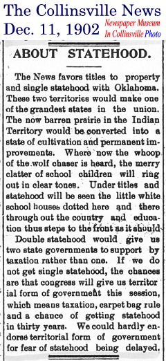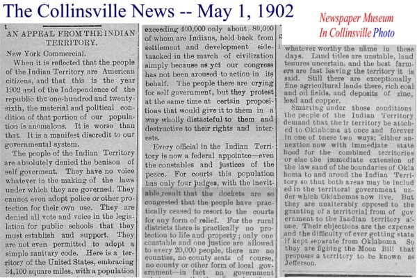 The 1902 "complaint" (above) from Indian Territority was reprinted in "The Collinsville News" from a New York publication more than 5 years before statehood. |