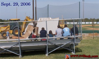 | A new spectator sport? -- pressbox demolition derby -- in case you didn't check the softball coverage from Friday here is another photo of the old CHS baseball pressbox being torn down. The existing bleachers were pulled back out of the way of the heavy equipment but provided seating for the baseball players and other fans who were aware what was going on Friday. |