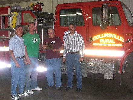 | These (submitted) photos are from a retirement dinner for Randy Felkins who was on the Collinsville Rural Fire Dept. for 23 years.We at the CRFD would like to send a special thanks for his support and dedication to the community. In the picture with truck are from left to right Mike Worstell, Tim Nelson, Randy Felkins, and David Kirwin. These gentleman are our board of directors. Once again thank you Randy for the years of service. -- Your Fellow Firefighters (Oct. 1, 2006) | |