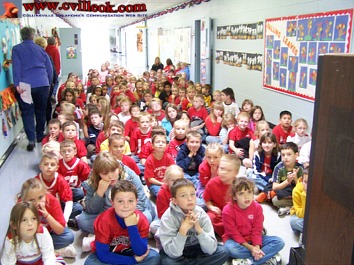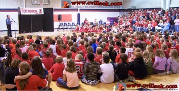 Students at Herald Elementary listen to Police Officer Boggs Friday afternoon during their "Red Ribbon" program explaining why they needed to stay drug free. There were several other speakers. Wilson Elementary also had a program Friday (as well as schools nationwide). |