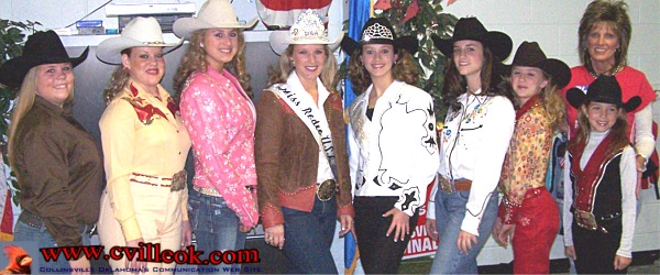 Miss Rodeo USA 2007 (from California) was joined on her Collinsville tour Friday by several local ladies from Owasso (and Collinsville) Roundup Clubs. L-R: Kimberly Dixon, Jordan Helm, Alexis Bell, Candice Caper, Morgan Roberts, Sydney Spencer, Maegan Gardner, Cori Ingram (& Wilson Principal Corsair Thurman). |