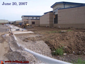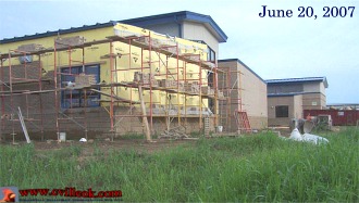 The exterior brick work on the new Early Childhood Center is nearing completion. The top photos show the NW corner and back of the building and the photo below shows the front of the building. The entry drive is now open for the adjoining soccer & baseball fields but the parking area is not. (Previous Coverage) |