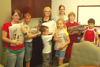 ![]() City Manager Pam Polk assits the Collinsville 4-H members by donating approximately 60 pounds of newspapers and magazines. Club members pictured (not in order) are: Karen Klein, Jennifer and Tyler Lutz, Greg and Emily Haan and Micah Cooper. Also pictured is 4-H Friend Cody Faith. |