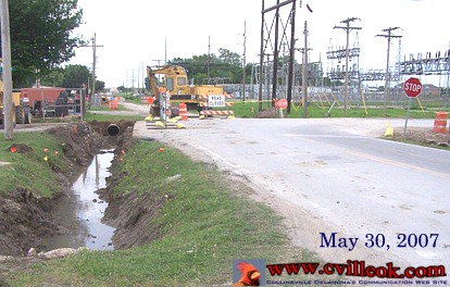 Road work at the intersection of 5th and Broadway continues. The view Wednesday (above) almost looked like a 5th Street bridge was needed as the roadway had been removed temporarily leaving just a water filled ditch stopping any traffic to/from the north on 5th. Broadway traffic to/from Main was still flowing. (Previous Coverage). |