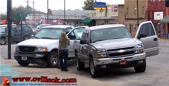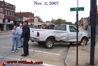 | Three pickups tangled Friday afternoon Nov. 2nd at 11th & Main. There were no injuries but the white pickup below was a bit crimped. |