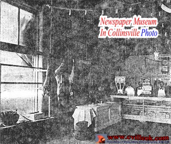 This ~1913 photo shows that same window when the building was a grocery store with sides of beef hanging in the open. |