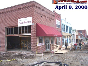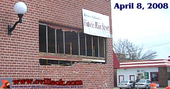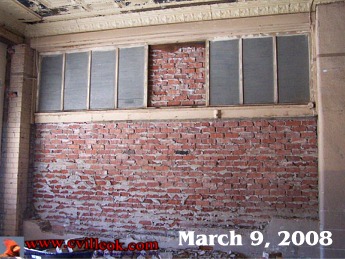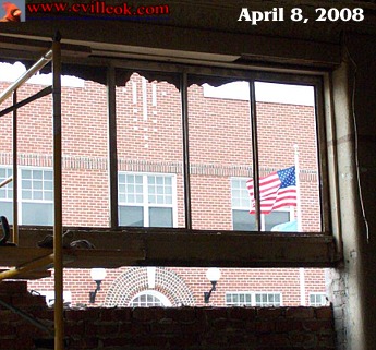 By Wednesday April 9, 2008 the remaining exterior bricks had also been removed from the lower portion of the window. Work also continues on the sidewalks on the west and north sides of the annex building as part of the TEA-21 Main Street Beautification Project. |
