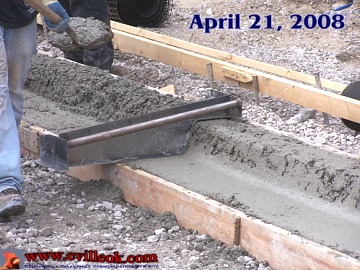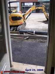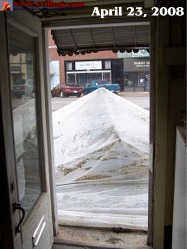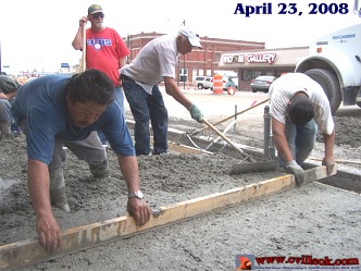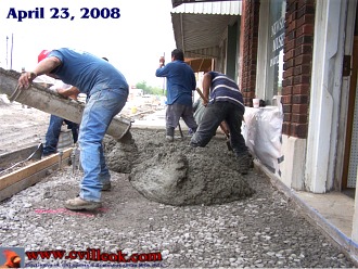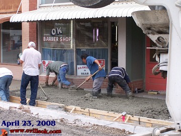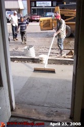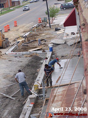 New sidewalk maybe? -- Crews poured and formed new sidewalks in front of several buildings on Main Street today. The effort was delayed by heavy rain about 4:30pm but even before that, concerns had been raised on the water content of the material delivered. I have no official word yet on the outcome of that concern. -- Ted 5pm Wed. April 23, 2008 |