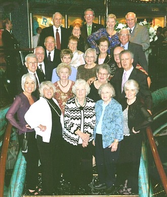 | Front row: Joyce Fleming Tate ('64), Wanda Gaylord Coulter ('58), Murrell Roberts Coast ('52), Lola Gaylord Reeves ('50), and Susye Fleming Monroe ('56). 2nd row: Don Brinkley/Carolyn Fifer Brinkley ('55), Delcy Troglin Dunham ('59)/David Dunham. 3rd row: Frank Beu ('54)/Shirley Beu, Kathy Stephenson Reser ('56), and Bob Coppedge ('56). 4th row: Val Inbody/Emma Lynch Inbody ('57), Shirlene Gaylord Kerr ('55)/Don Kerr. Back row: Bruce Williams/Shirley Payne Williams ('53), Ron Evans ('55), and Evelyn (Tunnie) Kilpatrick Fifer ('59)/Charles Fifer ('54). |