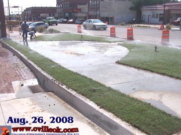 | Grass has been added around the sidewalk at the south end of the City's unfinished plaza with a sprinkler system to keep it green. I'm still waiting to see what (other than the curb) will keep unfamiliar drivers from South 11th from attempting to drive through the former intersection when the orange barrels are eventually removed? -- Ted Wright (8/29/2008) |
