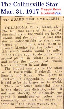 Collinsville's two smelters (which were built in 1911) made it one of Oklahoma's (& the world's?) largest zinc smelter operations in this 1917 pre-war story. |