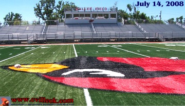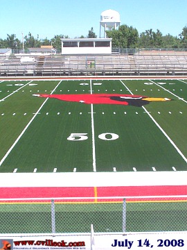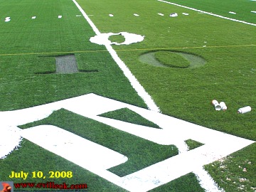 With the massive mid-field Cardinal now in place, CHS athletic director Bill Rule is wondering what can be done to assist officials with football spotting and measurements on top of the "bird". The sand and rubber filler placement is due later this week with lettering completed in the north endzone but still in progress Monday afternoon July 14th in the south endzone (below). |