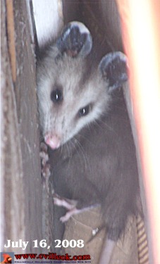 I've been expecting to catch what I assume is a small mouse at the news museum this week but was startled with this view when I opened the back door this morning. My immediate reaction was that my mouse was really a large rat ... but after a calmer review ... decided I had a baby possum which I managed to shove out the back door with a board. I think my mouse is still around but glad to have at least one stranger removed from the premises. -- Ted Wright 7/16/2008 |