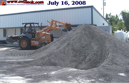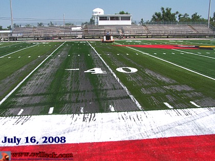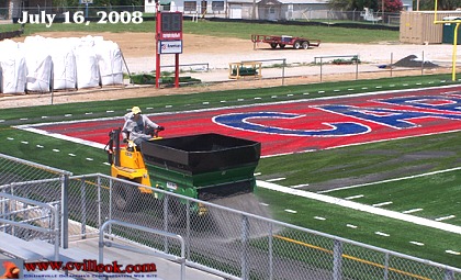 With all the field turf in place now (with permanent yard lines, hash marks, numbers and words all sewn or glued in with fiber of different colors) the filler material that will hold those fibers up (and cushion the playing surface) was being added Wednesday July 16th. |