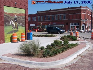 Landscape greenery at NE corner of 11th & Main is now in place. With quite a bit of finishing work still remaining (lamp posts, trees, asphalt, etc...) there is some resemblance now to the preliminary (2004) drawing below. (Previous Coverage) |